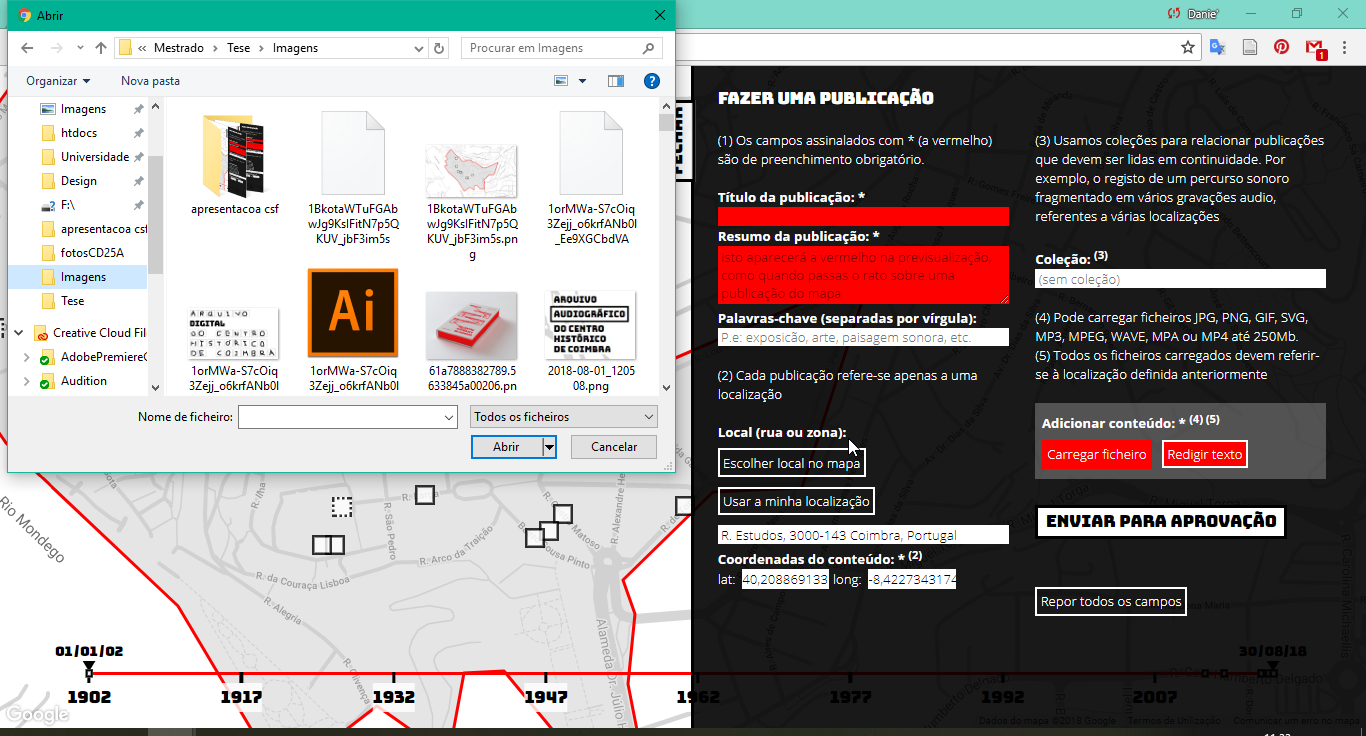 This project, in the scope of my masters degree dissertation, is about the back-end and front-end development of the website of the Digital Archive of Coimbra’s Historical Center and the respective interface/interaction design. In addition, it is about designing its graphic identity and dissemination artifacts.